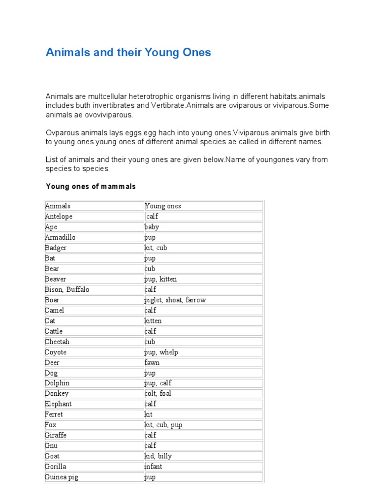Animals And Their Young Ones Pdf Calf Birds